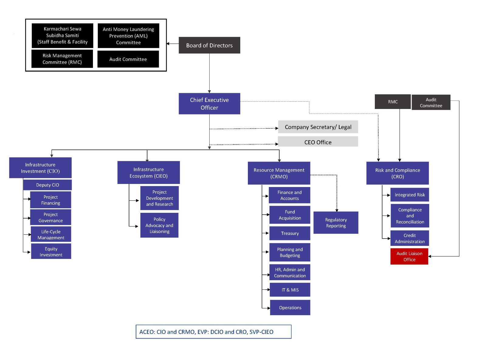 The management structure has been broadly clustered into four verticals, i.e. Infrastructure Investment, Infrastructure Ecosystem, Resource Management and Risk and Compliance. NIFRA is conceptualized as a lean organization structure wherein process, skills and technology will be leveraged to ensure higher productivity.
