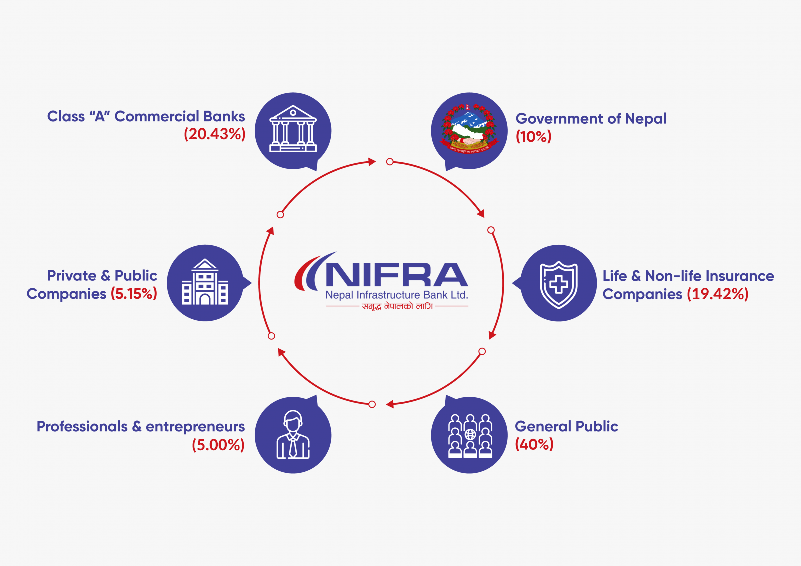 Nepal Infrastructure Bank Limited (NIFRA) is Jointly promoted by Government of Nepal, Class ‘A’ commercial banks, insurance companies, public and private sector leading entities, and team of entrepreneurs along with 40% stake from General Public.